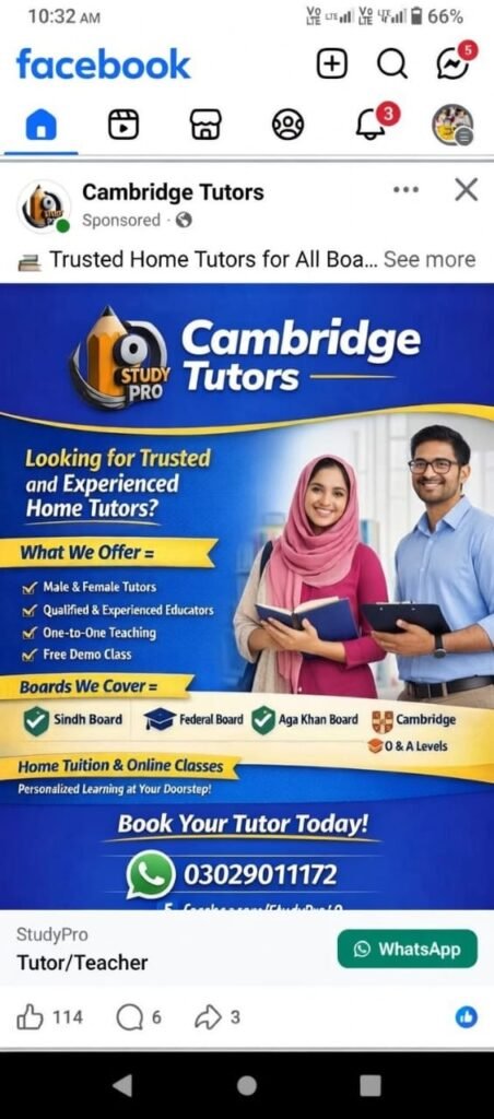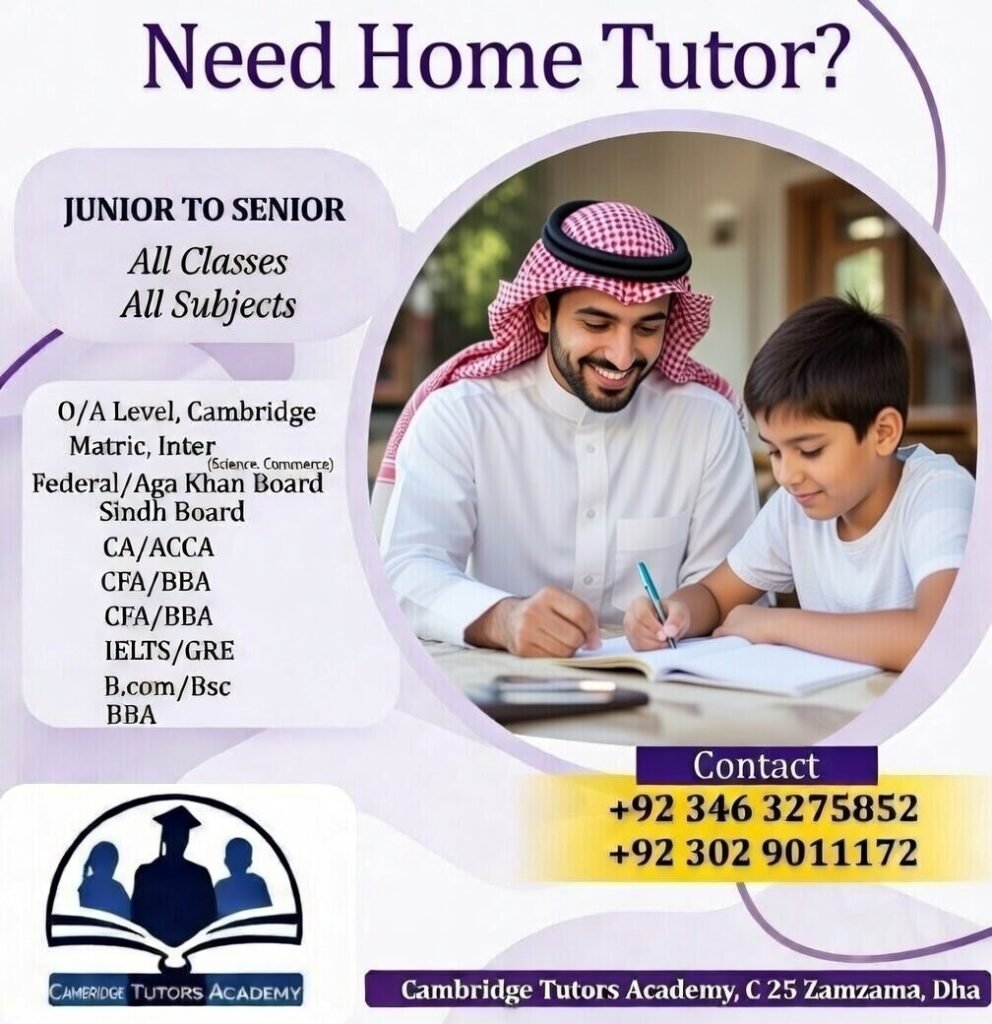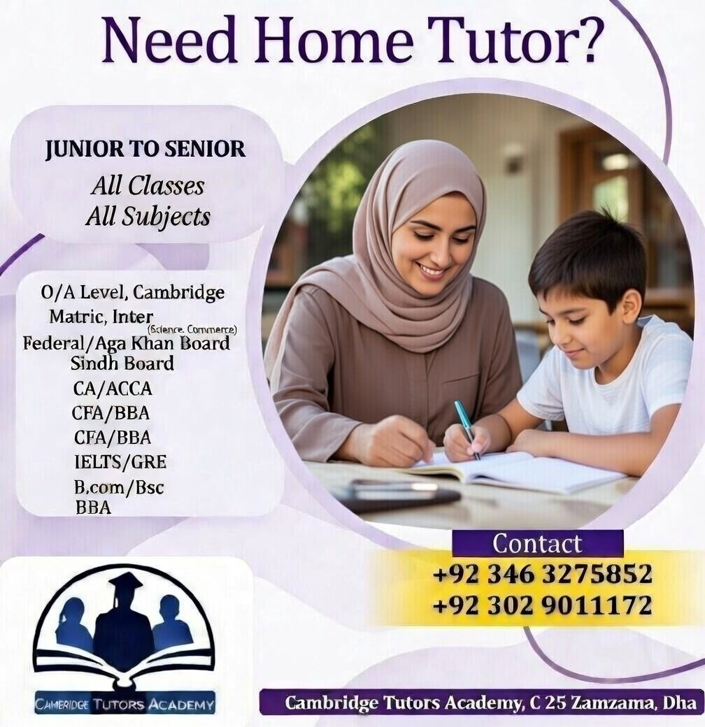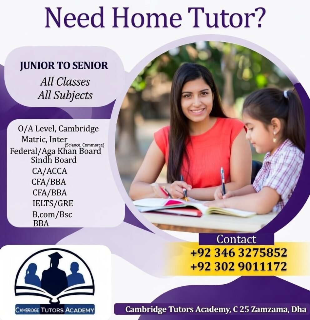 We provide qualified home tutors across Pakistan for all classes, subjects, and educational boards, including Cambridge, O Level, A Level, Matric, and Intermediate.